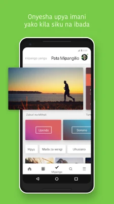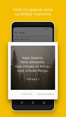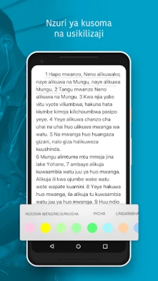Badilisha uzoefu wako wa Maandiko kwa kupendeza na zana mbalimbali za YouVersion. Angazia mistari unayoipenda kwa rangi tofauti, weka alamisho muhimu, na andika madokezo yako binafsi au shirikiana na wengine. Unaweza pia kuunda picha za mistari yenye kuvutia ili kushiriki hekima ya Neno la Mungu kwa urahisi. Soma ukiwa mtandaoni au pakua matoleo maalum kama vile Biblia Takatifu (Swahili Union Bible) na Biblia Habari Njema kwa ajili ya kusoma bila mtandao. Furahia Biblia za sauti ili Neno la Mungu likufikie popote, na rekebisha mipangilio ya usomaji ikiwemo ukubwa wa herufi na nafasi, hata kusoma gizani kwa faraja kamili.