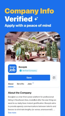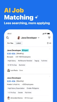 Kwa wanaotafuta kazi, bossjob inatoa mapendekezo ya nafasi za kazi zilizoboreshwa kulingana na ujuzi, mapendeleo, na malengo yako ya kikazi. Sahau kusubiri majibu ya barua pepe; sasa unaweza kupiga gumzo moja kwa moja na waajiri, kujadili maelezo ya kazi, kuratibu usaili, na hata kukubali ofa kwa haraka. Tumia Zana ya Kuunda Wasifu kwa AI ya bossjob kuboresha CV yako na kuongeza nafasi zako za kupata usaili. Gundua fursa za kipekee za kazi za mbali na za ndani nchini Ufilipino kutoka kwa waajiri wanaoaminika na wanaopiga kazi sasa.