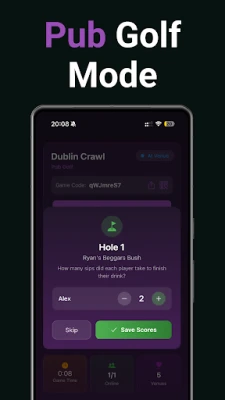 Usiwahi kupoteza mwelekeo tena kwa kutumia mfumo wa urambazaji uliojengwa ndani ya PubCrawl. Furahia maelekezo sahihi ya kutembea na umbali wazi kati ya kila kituo, ukikuongoza bila shida hata katika miji usiyoijua. Fuatilia maendeleo yenu kwa urahisi, weka alama kwenye kumbi mlizotembelea, na ujue ni wapi mmevuka hatua katika safari yenu ya kujiburudisha. Je, mnahitaji kuchukua mapumziko au kuendelea baadaye? Hifadhi matembezi yako wakati wowote na uyaendeleze baadaye bila shida, ukihakikisha furaha haikatishwi. Na kwa wale wanaopenda michezo, ongeza ladha ya ushindani wa kirafiki na michezo ya kijamii iliyounganishwa kama vile "Pub Golf," kamili na ufuatiliaji wa alama moja kwa moja ndani ya PubCrawl. Ni kamilifu kwa ajili ya usiku wa kijamii, kugundua maeneo mapya, au kuunda kumbukumbu zisizokumbukika na marafiki.