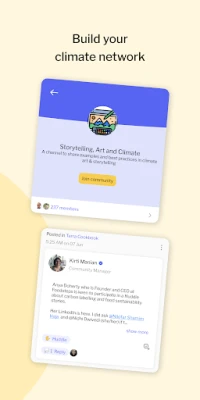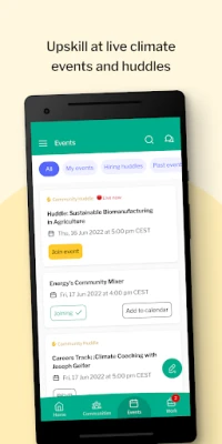 Ndani ya Terra.do, utagundua jumuiya inayostawi inayojumuisha zaidi ya makundi 50 yenye mada tofauti, kuanzia Nishati Mbadala na Ustahimilivu hadi Uondoaji wa Kaboni. Ungana na wataalamu wenzako wanaofanya kazi katika suluhisho za hali ya hewa na panua mtandao wako kwa kiwango cha kimataifa. Utapata wataalamu kutoka nyanja mbalimbali, ikiwemo mameneja wa kuajiri, wajasiriamali, na washiriki wa programu, wote wakiwa tayari kushirikiana na kuunga mkono. Kushiriki katika matukio ya moja kwa moja, mikutano midogo, na vipindi vya Maswali na Majibu ni njia nzuri ya kukuza ujuzi na kuungana na watu wenye malengo kama yako.